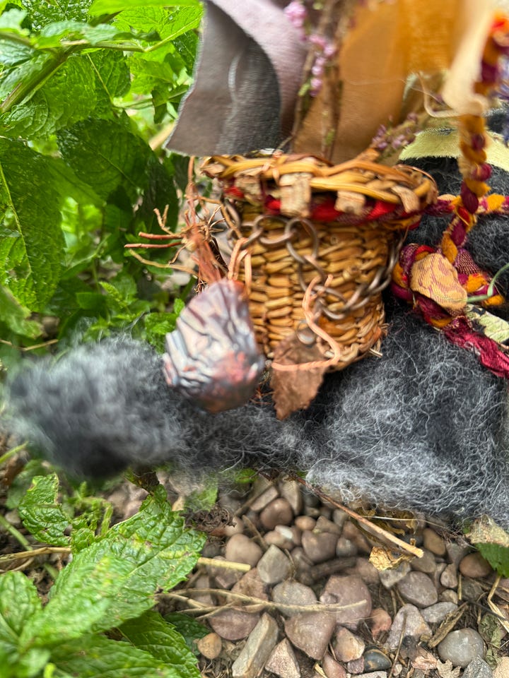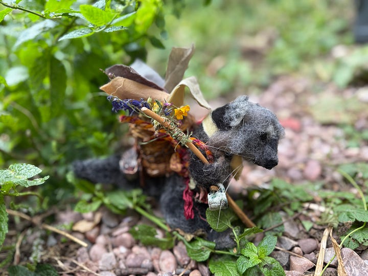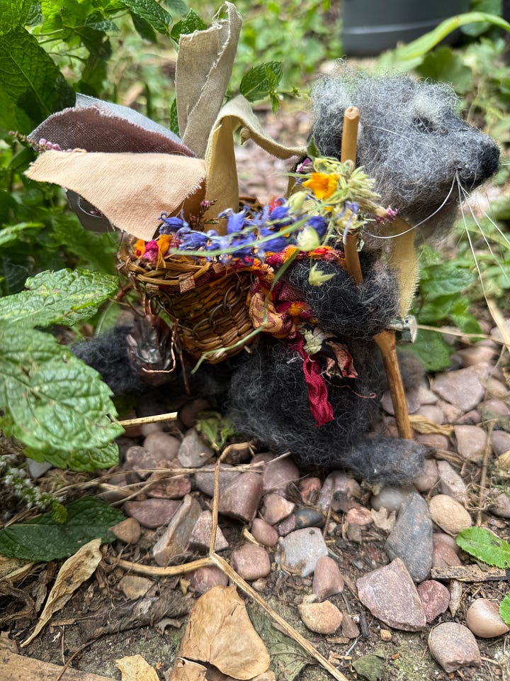My itchy feet moved to itchy fingers to make one of those more folklorey type pieces. I wanted to make one animal that wandered the lands, with a woven pack on their back and a walking stick, like the badgers I make, though those are local so needed someone new. One with a basket with lots of things hanging off it.