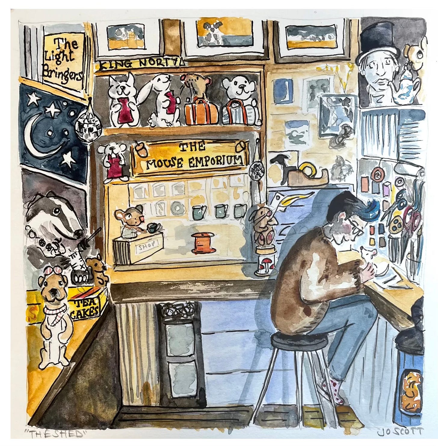 Last time Jo came to the Shed, she painted me in the shed. You can read about her visit here